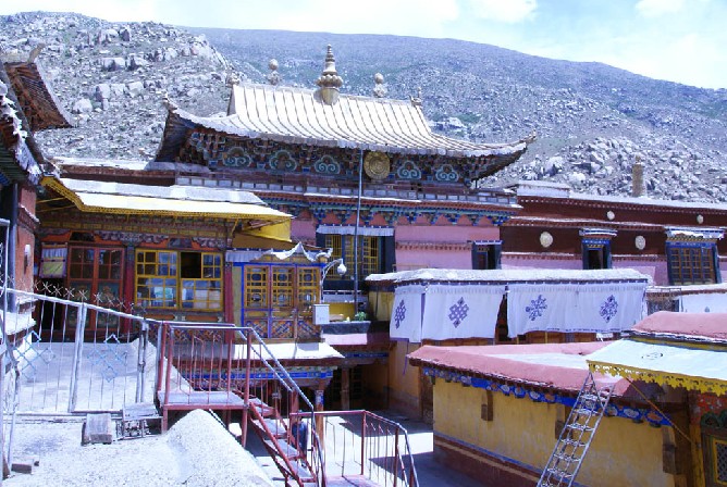 從拉薩市中心坐4路公交、出租車或者三輪車只能到山腳,然后要徒步30分鐘上山。寺廟每周三都有法事活動(dòng),眾喇嘛齊聚一堂念經(jīng),場面壯觀。