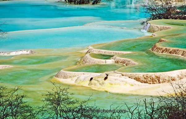 溝內(nèi)布滿乳黃色巖石,遠望好似婉蜒于密林幽谷中的黃龍,黃龍溝名即來源于此。明代(公元1368~1644年)在此修建了黃龍寺,用以奉祀黃龍。黃龍溝以它“奇、絕、秀、幽”的自然景觀而蜚聲中外,它酷似中國人心目中“龍”的形象,因而歷來被喻為“人間瑤池”、“中華象征”。在當?shù)馗鼮楦髯遴l(xiāng)民所尊祟,藏民稱之為“東日·瑟爾峻”,意為東方的海螺山(指雪寶山)、金色的海子(指黃龍溝),并沿襲著一年一度盛況煊赫、波及西北各省區(qū)各族民眾參加的轉(zhuǎn)山廟會。 黃龍溝連綿分布鈣化段長達3600米,最長鈣化灘長1300米,最寬170米;彩池數(shù)多達3400余個;邊石壩最高達7.2米。