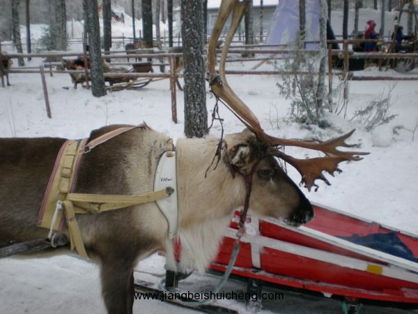 漫步到林邊有個(gè)以木欄圍著的鹿園。鹿在芬蘭是多產(chǎn)的動(dòng)物,有時(shí)車在公路上穿過(guò)樹(shù)林,也會(huì)見(jiàn)到一群鹿走過(guò),又或者在路旁覓食。夏天它們懶洋洋地躺在草坪上養(yǎng)生;到了冬天,特別是圣誕節(jié)時(shí),它們卻成為圣誕老人及游客所專用的,拖著它們?cè)诼管囉谘┑厣巷w馳,讓雪花飄面,使圣誕卡上的情景活現(xiàn)于現(xiàn)實(shí)中,十分迷人。