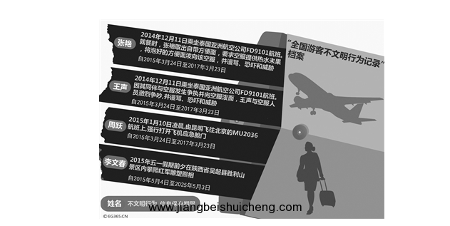 在國家旅游局官網(wǎng)上的“游客不文明行為記錄”專區(qū)中,從去年年底至今年五一小長假,引起國內(nèi)外關(guān)注的大鬧亞航、強(qiáng)行打開飛機(jī)艙門、攀爬紅軍雕塑等不文明事件的當(dāng)事人都榜上有名。