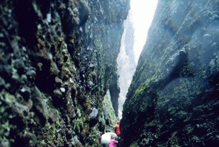 一閘險(xiǎn)一閘,閘閘景不同。水井入谷口處,為“一道閘”。南北山崖壁立,谷底難容一足,眼前是一層樓高的“天梯”通道。出了“一道閘”,抬頭仰望南面半山崖有一處月牙形的龐然大洞;拾級(jí)而上,一個(gè)能容千人的石洞,常年干爽明亮、冬暖夏涼,這里被人們稱為“石窟王宮”。進(jìn)入“二道閘”,它比起“一道閘”更加窄長(zhǎng)、更加險(xiǎn)峻。剛才是陽(yáng)光明媚,轉(zhuǎn)眼間便是天昏地暗。抬頭便可望見(jiàn)兩崖?lián)翁欤闶侵摹耙痪€天”景觀。天設(shè)地造,極其美妙。在閘內(nèi)可以看見(jiàn)南面懸崖上飛濺出一道高約50米、寬5米的“水簾”,似乎向攀巖者彈奏出歡快的迎賓曲。“三道閘”上下約有三層樓高,人們無(wú)處落腳,比黃山的“鯽魚背”更險(xiǎn)一籌。身后是萬(wàn)丈深淵,腳下峭壁陰森,穿過(guò)小水潭,隱約能看到懸崖峭壁之間有一條縫隙,其名“地縫”,循著人工開鑿的石凹,手腳并用往上攀爬,進(jìn)入谷內(nèi),有一種豁然開朗的感覺(jué),攀上谷口時(shí),不妨回頭細(xì)看兩石壁上閘痕清晰可辨,谷內(nèi)就是古時(shí)的避王巖。