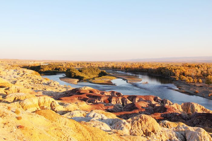 五彩灘位于阿勒泰地區(qū)布爾津縣境內(nèi),額爾齊斯河北岸,它是懸崖式的雅丹地貌,山勢(shì)起伏、顏色多變,這里的巖石以紅色為主,間以綠、黃、白、黑及過渡色彩,在不同光線照耀下,更加色彩斑斕、嬌艷嫵媚, 一般的雅丹地貌周圍都是戈壁荒漠景觀,但五彩灘的奇妙和非凡之處在于,它處在美麗的額爾齊斯河谷里,河對(duì)面是一片郁郁蔥蔥的綠洲,截然不同的地貌,就這樣唇齒相依般依偎在一起,一河隔兩岸,儼然兩重天,對(duì)比強(qiáng)烈又渾然天成。因此五彩灘被稱作新疆最美的丹雅景觀。