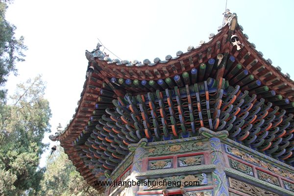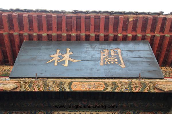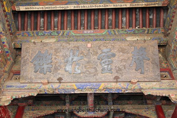 仰面觀之,有一塊大匾高高懸在大門上,上書“聲靈于鑠”四個(gè)大字,寓意關(guān)公美好的聲名象美好的音樂一樣傳揚(yáng)四方。這塊匾是清乾隆十五年乾隆帝所題,同時(shí)兩側(cè)并題有聯(lián)曰:“翊漢表神功龍門并峻,扶綱伸浩氣伊水同流。”由此可以看出,不僅百姓敬仰關(guān)公,古代帝王對(duì)關(guān)公也同樣尊崇。