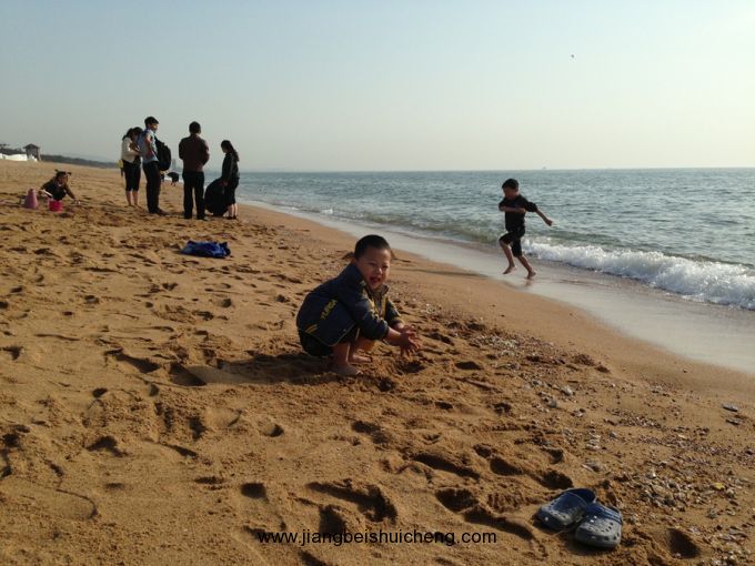 你看那個小男孩兒,被海浪打上來了吧,還是老實點兒玩沙子吧