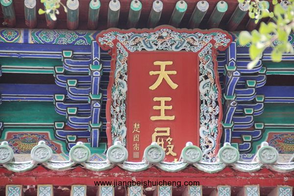 經(jīng)甬道過碑林后便是天王殿,三間重檐歇山頂?shù)钐茫饷嬗袃纱蠼饎偅瑑?nèi)里則是四大天王像,威武雄壯。