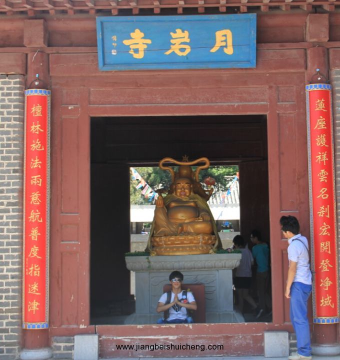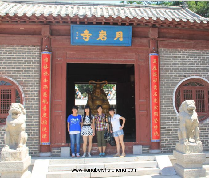 山坡上有一條新修建的臺階路,直通山頂。據當地老鄉(xiāng)說,上面有一尊大佛,還有古長城圍墻。于是,雖然天氣炎熱,我們還是想一探究竟。臺階較陡,拾級而上不多時就汗流浹背氣喘吁吁。在半山腰山道左邊,一尊面目慈祥的石雕坐佛依山望湖。再往上,很快就登頂了,發(fā)現所謂的古長城圍墻不過是用碎石堆砌而成。下山之后,我們繼續(xù)驅車繞山而行,至山的背面,有一月巖寺。月巖寺坐落在昆山的西側,一說創(chuàng)建于漢代,一說始建于唐代。其藏居深山,古樹掩映,晨鐘暮鼓方知山中有寺。