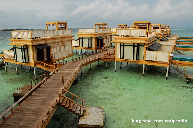這就是維拉瓦魯?shù)乃衔萘耍ㄟ^(guò)一條木板走廊鏈接在一起,遠(yuǎn)處綠色的那一片,就是主島,俗稱海龜島