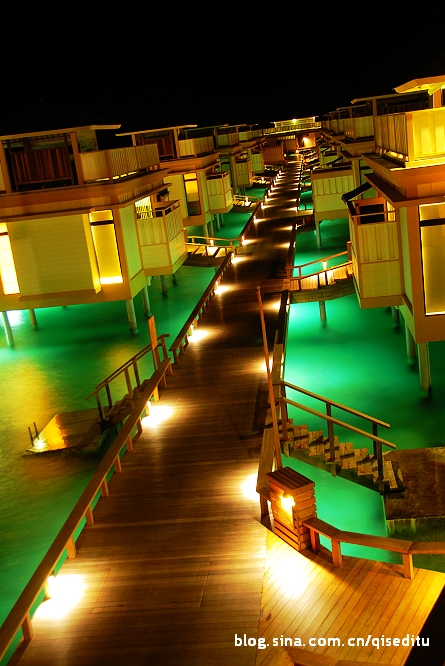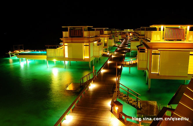 晚上的水上屋,晶瑩剔透浮在水上,更有一層夢(mèng)幻效果