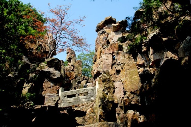 秋景:相傳出自清代大畫家石濤之手筆。秋景用黃山石堆疊而成,山勢(shì)較高,面積也較大。整個(gè)山體