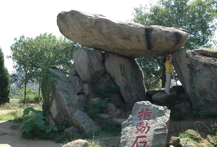 指動(dòng)石旅游風(fēng)景區(qū)依山傍水,山間巨石林立,其間最著名的便是那塊一指可動(dòng)的百噸奇石了,它長(zhǎng)7米,寬5米,重達(dá)百噸,而如此龐然大物,卻可憑游人一指之力,上下顫動(dòng)。面對(duì)如此奇觀,攝影家們也紛紛走上前去,感受百噸巨石在自己的手指下微微顫動(dòng)的奇妙感覺(jué)。指動(dòng)石還有另一奇特之處,那便是在它的底部有一幅中國(guó)地圖,大西北、東三省、寶島臺(tái)灣都?xì)v歷在目,于是指動(dòng)石便有了另一個(gè)豪邁的名字——“指點(diǎn)江山”。