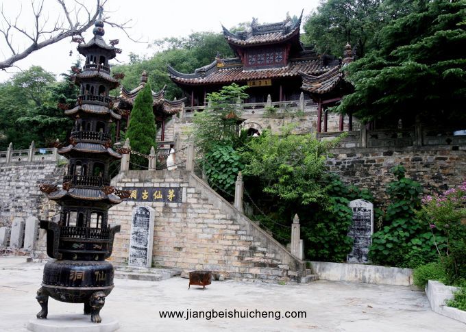 洞前建有兩層磚木結(jié)構(gòu)的正殿一座,殿寬三間,飛檐翹角,額懸“茅仙古洞”四字木匾,殿旁建有六角涼亭;洞附近有大禹治水處、劉安瘃冉井、壽塘關(guān)等名勝古跡。