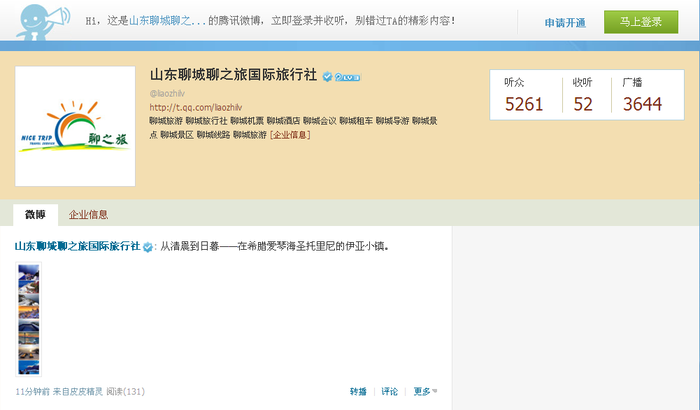【網(wǎng)宣部】截止2012年12月28日,聊之旅國(guó)際旅行社新浪官方微博http://e.weibo.com/liaozhilv粉絲突破12萬人!騰訊官方微博http://t.qq.com/liaozhilv聽眾突破5000人。
