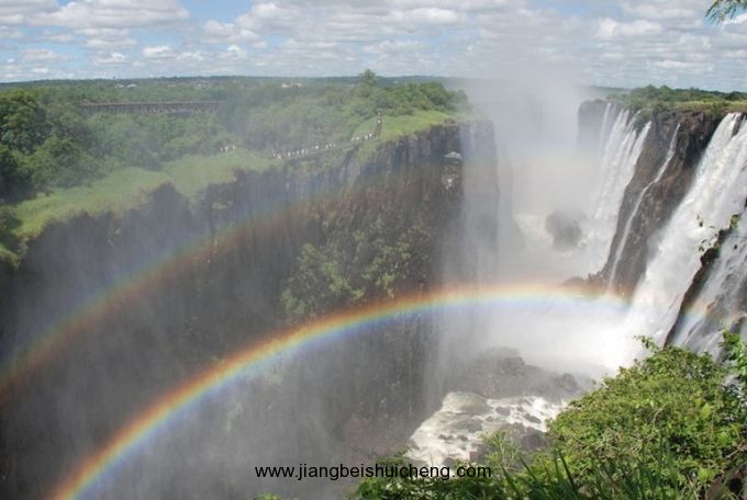 當贊比西河河水充盈時,每秒7500立方米的水洶涌越過維多利亞瀑布。水量如此之大,且下沖力如此之強,以至引起水花飛濺,遠達40公里外均可以看到。維多利亞瀑布的當?shù)孛质恰癕osi-oa-tunra”(莫西奧圖尼亞),可譯為“轟轟作響的煙霧”。彩虹經(jīng)常在飛濺的水花中閃爍,它能上升到305米的高度。離瀑布40--65千米處,人們可看到升入300米高空如云般的水霧。