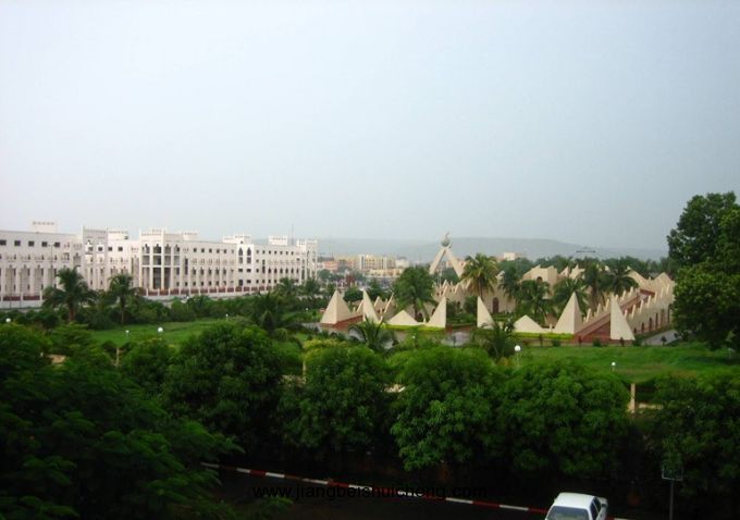 紅色、棕色、黃色和白色等等各種小巧玲瓏的建筑,在熱帶樹木濃密的樹葉中若隱若現(xiàn),這些建筑既有阿拉伯的風(fēng)格,又有西非地區(qū)特色,猶如童話中的宮殿一般。每年旱季時,這里萬里無云,滴水不降,除了一些常綠色的樹木和人們種植的花草依然生氣勃勃地生長以外,巴馬科似乎憔悴枯黃了,但是沒有秋風(fēng)和涼意,使人們覺得別有一番風(fēng)趣。從山頂眺望,巴馬科全城景色可以盡收眼底。山下有一座動植物園,園內(nèi)有奇花異木和珍貴的動物。