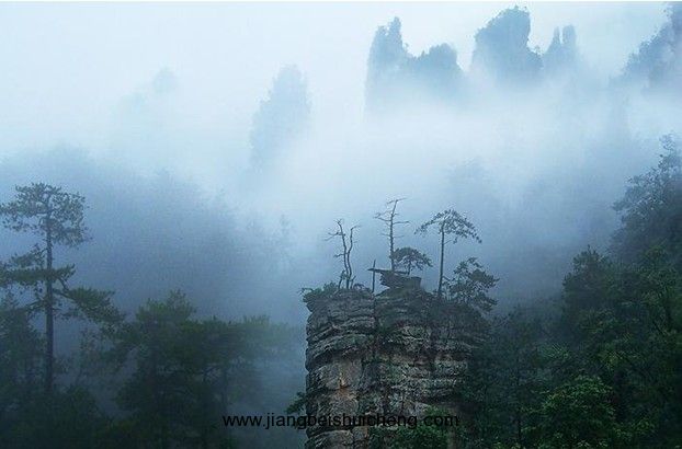 在小雨下拍攝景物,因雨點太小而令其在景物中不夠明顯,故不能表現出雨條。但是,利用蒙蒙細雨在拍攝深色調的樹林或山層,由于景物中沒有陽光照射而 盡是深色調的物體,毛毛細雨在深色的物體間就會如霧層一樣,顯現出“遠淺近深”的色調,更能表現出如雨如霧的煙雨情景。