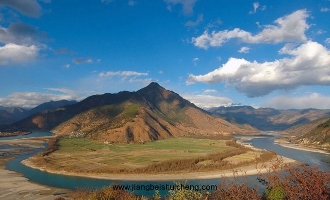 萬里長江第一灣位于中甸縣城南部沙松碧村與麗江石鼓鎮(zhèn)之間。萬里長江從“世界屋脊”青藏高原奔騰而下,在巴塘縣城境內(nèi)進入云南,與瀾滄江、怒江一起在橫斷山脈的高山深谷中穿行。到了中甸縣的沙松碧村,突然來了個100多度的急轉(zhuǎn)彎,轉(zhuǎn)向東北,形成了罕見的“V”字形大彎。遠眺,美麗的江灣恍若一彎上弦月飄落人間。