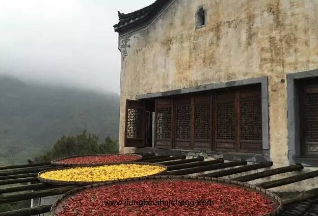篁嶺古村數(shù)百棟徽派古民居在百米落差的坡面錯(cuò)落有序,整個(gè)山間村落飽經(jīng)滄桑的徽式民居土磚外墻與曬架上、圓圓曬匾里五彩繽紛豐收果實(shí)組合,繪就出世界獨(dú)一無(wú)二的“曬秋”農(nóng)俗景觀、最美的鄉(xiāng)村符號(hào)。