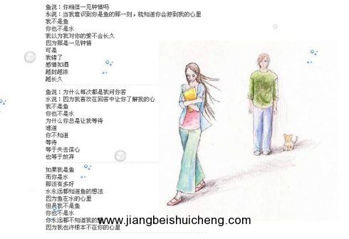 魚說:我不想給你一個(gè)兌現(xiàn)不了的承諾。水說:你為什么不能自私一點(diǎn)?魚說:別這樣,愛你是我的權(quán)利,愛我卻不是你的義務(wù)。水說:為什么我總是那么自私,那么固執(zhí)?為什么我沒有早點(diǎn)愛上你?魚說:別這樣說,那樣,我會(huì)走的很不安。水說:為什么你總那么好,好到讓我感到無地自容。