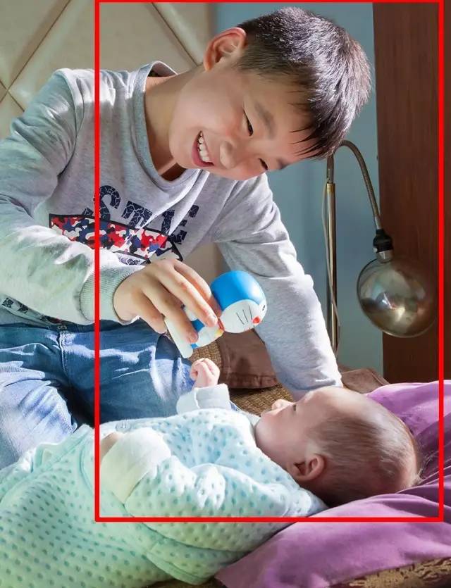 點評:一大一小、一臥一坐、一動一靜形成對比,反射光作為補光打到哥哥臉上,使畫面很生動。但整個畫面構圖隨意,如果想突出哥哥,可以稍作裁剪。