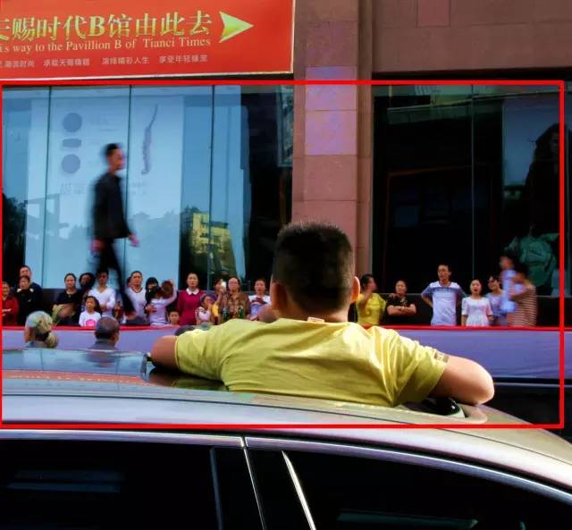 點評:T臺表演者的虛化,靜止清晰的男孩,慢速拍攝能更好地表現(xiàn)虛實、動靜的對比。但是,作者采取正方形的構圖不妥,左上角的紅色廣告牌有些搶戲,下部的車窗影響視線。剪裁后,畫面更簡潔明了。