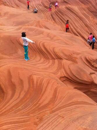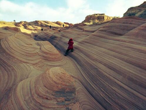 波浪谷是一種紅砂巖地貌,因巖砂上的紋路像波浪,被叫做"TheWave",即波浪。上世紀(jì)80年代,人們?cè)诿绹鴣喞D侵莺酮q他州交界處發(fā)現(xiàn)了波浪谷,神奇的外觀和極高的科研價(jià)值使其成為了世界八大巖石奇觀之一。而靖邊的波浪谷也有著與美國波浪谷媲美的紅砂巖峽谷。中國靖邊波浪谷和美國波浪谷的差距并不大,都是紅砂巖地貌,靖邊波浪谷更加年輕,只有6000萬年,很多砂土還沒來得及凝固為巖石,地處黃土高原與毛烏素沙漠交匯地帶的靖邊縣龍州鄉(xiāng)。