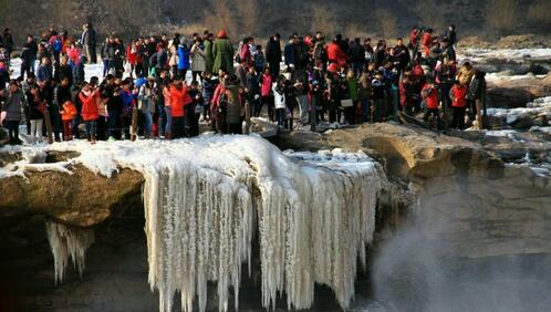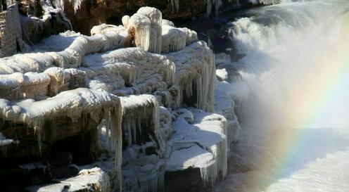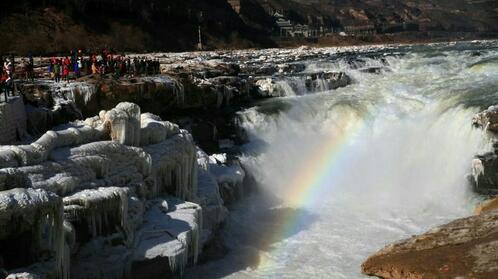 觀賞黃河壺口瀑布黃河壺口瀑布,其奔騰洶涌的氣勢(shì)如同中華民族的精神。它西臨陜西省延安市宜川縣壺口鄉(xiāng),東瀕山西省吉縣。黃河至此兩岸石壁峭立,河口收束狹如壺口,故名壺口瀑布。瀑布落差9米,蘊(yùn)藏豐富的水力資源。奔騰的黃河水聲震天地,絢麗的彩虹美輪美奐,輕煙生水底,冰掛透晶瑩,黃河壺口冬季美麗的自然景觀讓游人們流連忘返。