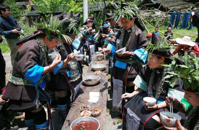 早餐后前往空申村寨依山而建,四周山巒起伏,林木蔥蔥,一條清澈的小溪從寨旁流過(guò),民居布局合理,吊腳樓鱗次櫛比。這里最為世人矚目的是每年一度的“茅人節(jié)”。每年農(nóng)歷二月至三月,成年男女青年不論年齡大小,結(jié)婚已否,凡自己樂(lè)意都可以任意找與自己情意相投的伴侶結(jié)隊(duì)到茅人坡扎茅人、對(duì)情歌、逗趣。特別意合情投者,則相互暗示,離群另尋靜處。節(jié)日氣氛熱烈、奔放、自由、浪漫。農(nóng)歷三月三,被譽(yù)為“世界超短裙故鄉(xiāng)”的榕江縣兩汪鄉(xiāng)空申苗寨人山人海,熱鬧非凡,苗族同胞歡聚一堂,慶祝自己最古老的“情人節(jié)”——茅人節(jié)。茅人節(jié)(古老的苗族情人節(jié))苗語(yǔ)為“撈沙麗”,又稱作“爬茅人坡”、“插茅人”。相傳,短裙苗族古時(shí)有本寨男女不通婚的習(xí)俗,婚姻由父母包辦,姑娘都要遠(yuǎn)嫁他鄉(xiāng),許多同寨青梅竹馬的男女不得不勞燕分飛。遠(yuǎn)嫁的姑娘陽(yáng)春三月均要返回娘家?guī)椭焊谧髦啵齻儽銕е叭卖巍毖s寨里的未婚姑娘和小伙子到山上唱歌,用歌聲抒發(fā)與心上人被迫分離,遠(yuǎn)嫁他鄉(xiāng)的傷悲,并勸告未嫁的妹妹不要遠(yuǎn)嫁,向情人傾訴內(nèi)心深處的思念。唱到后來(lái)常常是淚水漣漣,泣不成聲。為了表達(dá)對(duì)家鄉(xiāng)和情人的依戀,她們用新的嫩綠枝葉和茅草扎成高低大小不等的“茅人”把,捆在杉樹(shù)桿上,然后插在最高的山頂上,一般插兩邊低排列,中間最高的象征大姐,兩邊低的為妹妹,寄予姐妹情意。我們結(jié)束游覽,返回榕江入住休息。
