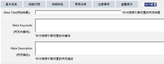 (2)(網頁關鍵詞):針對搜索引擎設置的關鍵詞 填寫線路內包含的景區(qū)景點名稱,以及涉及到的地名!(如:洲、國家、省份、市、區(qū)、縣等地名)
