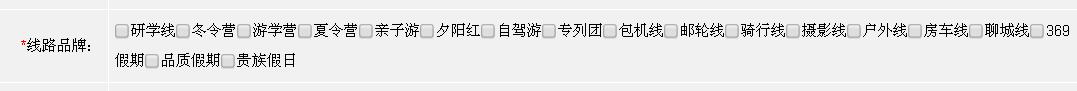(3)線路品牌:可多選。 (線路品牌有嚴格的限制,比如攝影和戶外線,這個是需要專業(yè)領隊帶隊的,再,包機線路,必須是包機線路才可以,不是所有的飛機團都是包機;線路必須定位準確,客戶才能最短時間找到哦。這個選項不是必選的,常規(guī)的行程可以選擇后面三個 369假期,品質假期,貴族假日 其中一個 分別代表公司產品低端 中端 高端 的分類)