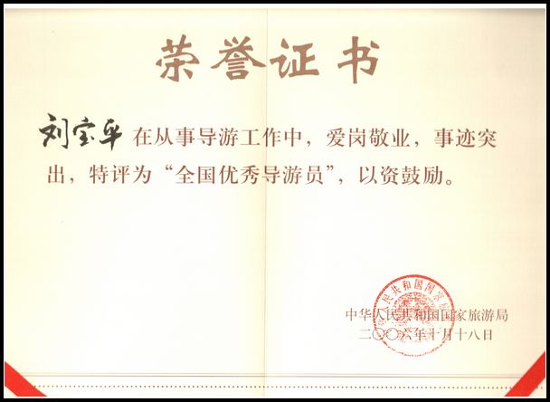 我公司是聊城市唯一全國優(yōu)秀導(dǎo)游員單位。2006年公司董事長劉寶平獲得中華人民共和國國家旅游局授予的“全國優(yōu)秀導(dǎo)游員”稱號,并受到吳儀副總理的親切接見。全國優(yōu)秀導(dǎo)游員帶隊管理,相信我們能為您提供最優(yōu)秀的旅游服務(wù); |