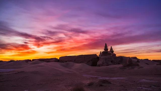 午后趕到【黑城遺址】(游覽時(shí)間約30分鐘)。(國慶時(shí)人多車堵,建議大家備一些干糧帶上)西夏古城黑水城位于內(nèi)蒙古西部額濟(jì)納旗巴丹吉林沙漠西北部,在西夏和元代時(shí)最為鼎盛,是古代絲綢之路上的重要城市。20世紀(jì)初,俄國軍人科茲洛夫和英國人斯坦因才在黑水城發(fā)現(xiàn)了大量的西夏文獻(xiàn),并運(yùn)送出境由于沙化嚴(yán)重,黑水城四周的城墻已有半數(shù)為流沙掩埋。遺址西北角上聳立的佛塔,基座也被風(fēng)沙剝蝕得裂痕斑斑,城中殘?jiān)珨啾陔S處可見。黑水城經(jīng)歷了歲月的滄桑,帶著風(fēng)沙的刻痕,在茫茫沙漠和戈壁依然聳立;