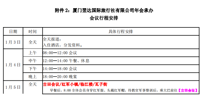 2、會議時間:2019 年 1 月 3 日→6 日。其中 3 號報到,4 號年會會議,5、6、號(6 號下午 5 點結(jié)束行程考察,不含 6 號晚餐及 6 號晚住宿)古田會議經(jīng)典路線考察(含古田會址、中復村、松毛嶺等)。