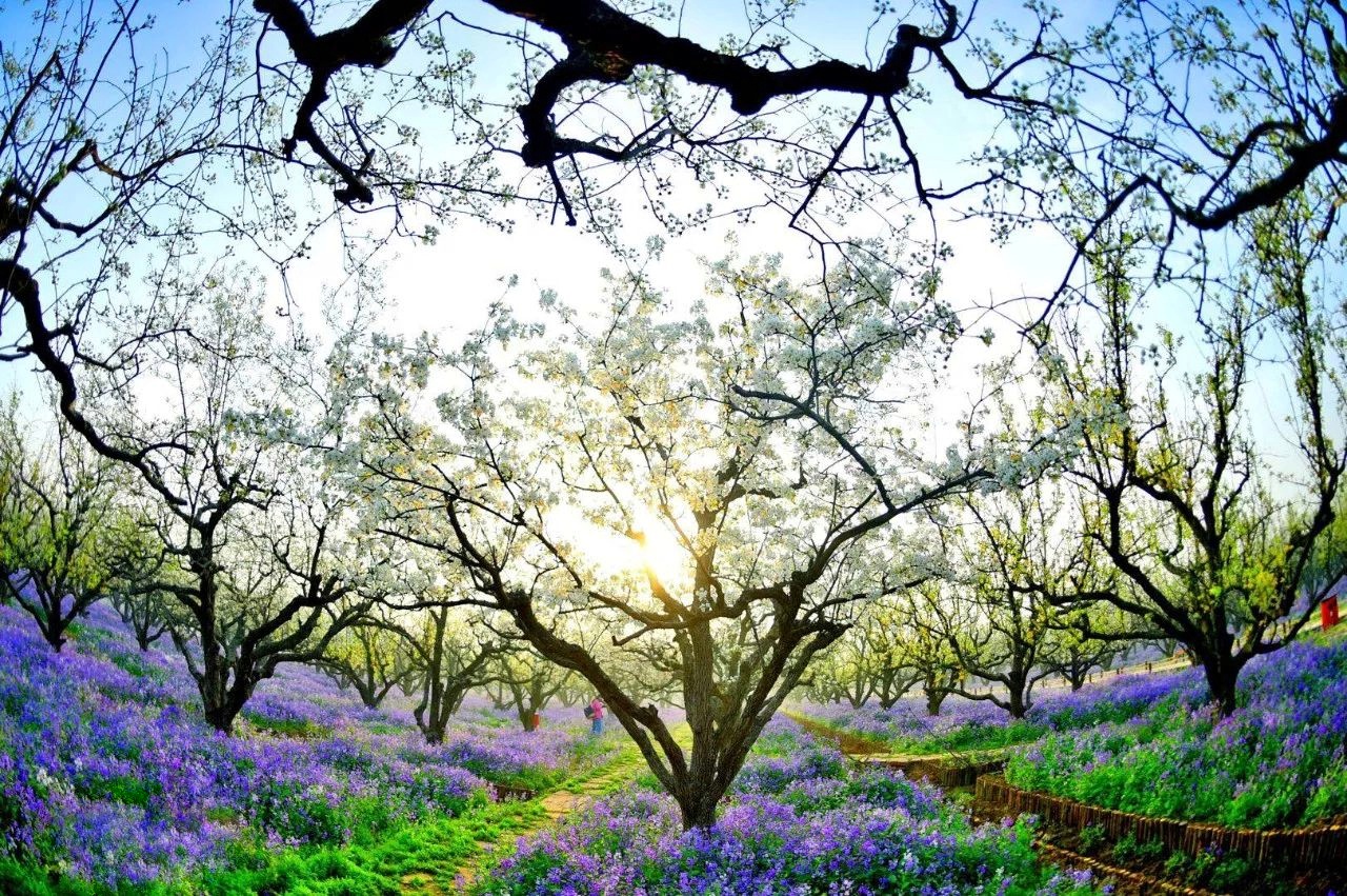 4、春季梨花盛開的季節(jié),這里是一片冰清玉潔的世界,白色的梨花紫色的二月蘭,一望無際的白紫交融的——梨蘭會;
