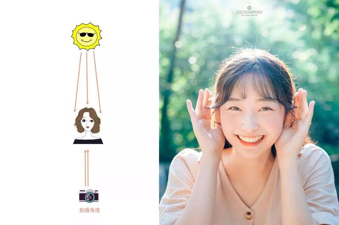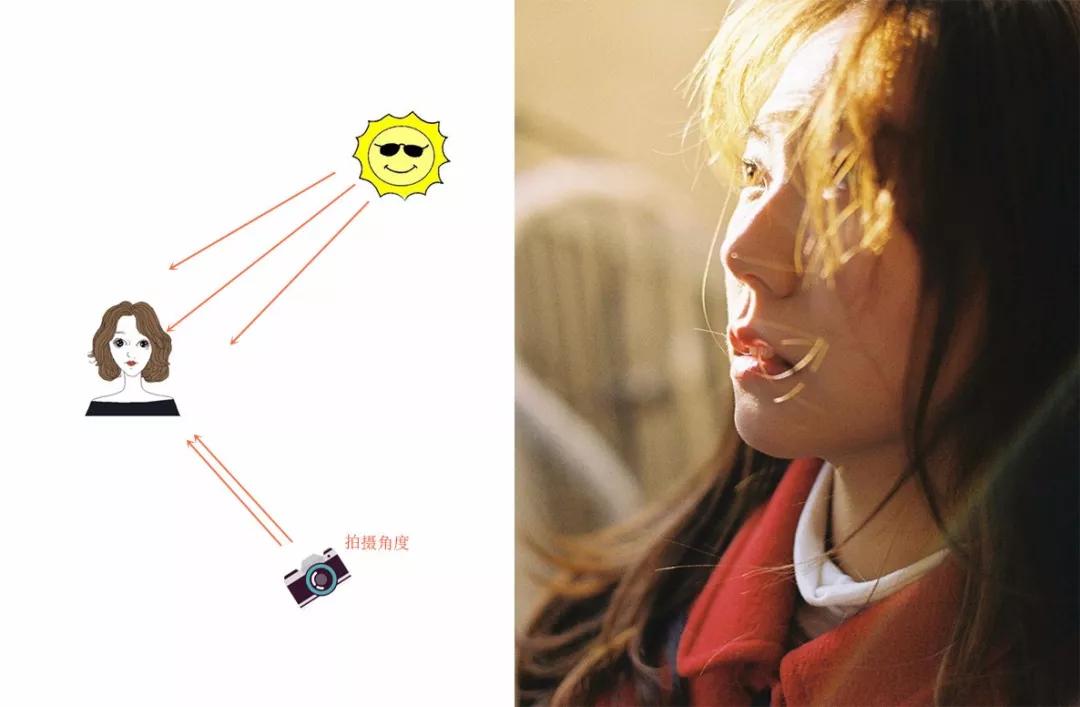 上面講的是逆光拍攝,還有一種是側(cè)逆光拍攝,當(dāng)太陽光線處在模特左邊或者右邊,就是側(cè)逆光。