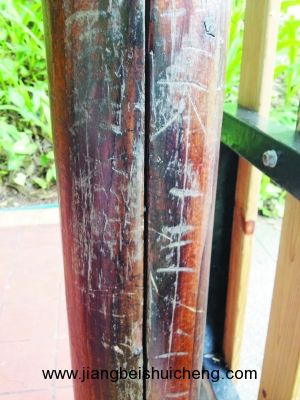 走進(jìn)光孝寺和六榕寺,白墻綠瓦格外寧靜。但寺內(nèi)的千年古樹卻遭殃了,在光孝寺觀音臺旁邊的竹群中,幾乎找不到一棵干凈的竹子。每一顆竹子上都刻有名字、×××與×××相愛到永遠(yuǎn)、平安等字眼。而在光孝寺放生堂附近的一棵千年菩提樹上,也有不少傷痕。六榕寺的清水磚墻平均不到一平方米的地方就有約兩三處涂鴉,由于寺廟有定期清理,因此記者看到一塊塊白色的痕跡。光孝寺寺內(nèi)的工作人員告訴記者:“佛寺比較森嚴(yán),游客不敢隨便在建筑上刻畫,但在樹木上刻畫就多了,我見到的大多都是年輕男女所為。”