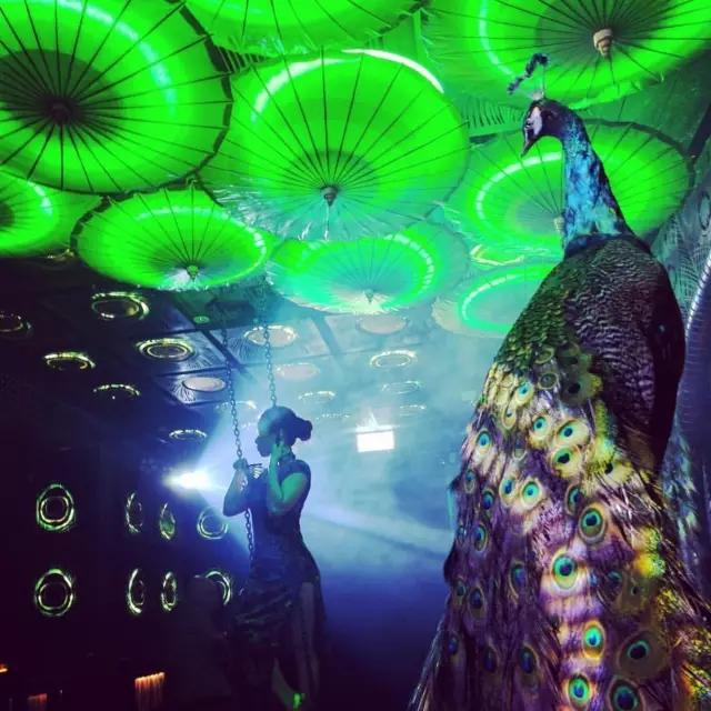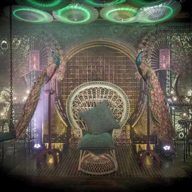 穿過一間鳥舍就來到奇幻的 Ophelia。以孔雀和鴉片館為靈感,奢靡,優(yōu)雅,震撼都不足以形容這里的東方風(fēng)情。中式的庭院,鐵鑄的玄關(guān)、孔雀羽毛制的壁燈和翠綠的天鵝絨沙發(fā),設(shè)計師仿佛在用搭建電影場景的方式設(shè)計酒吧。