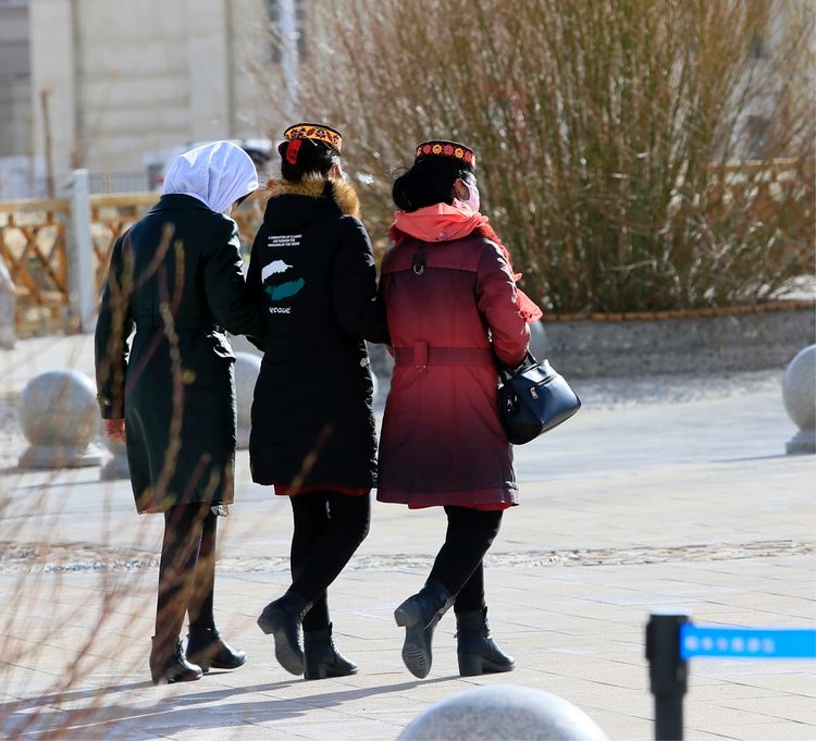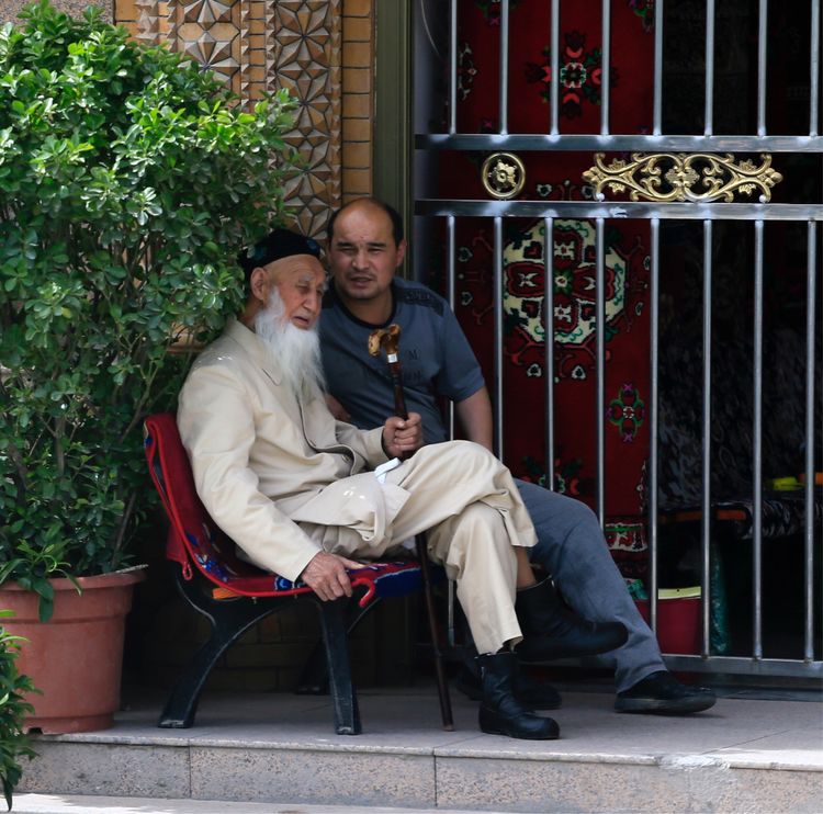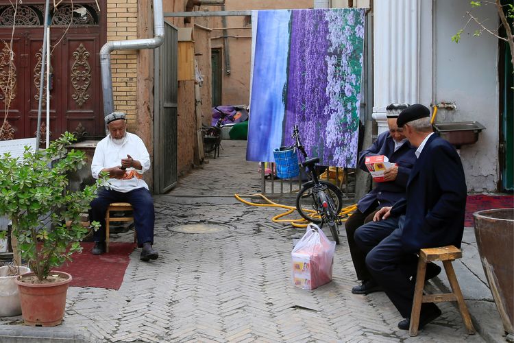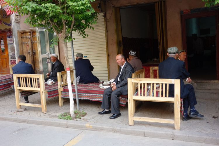 維吾爾族老人悠閑的聚集在一起品嘗著牛奶和美味早餐。