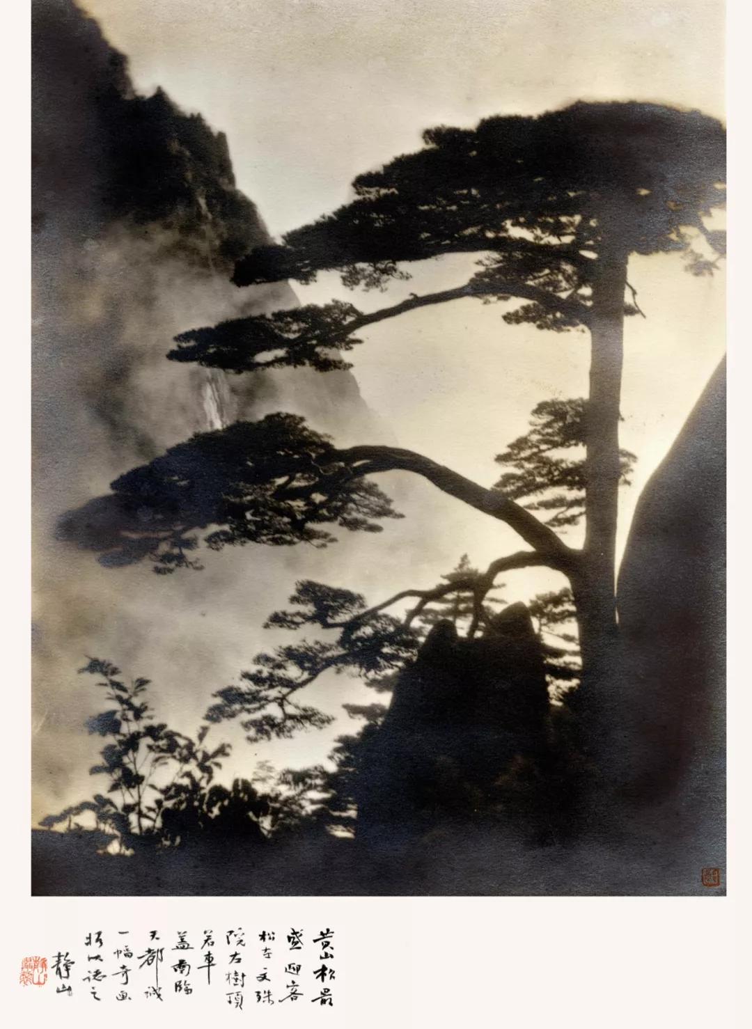 這件郎靜山創(chuàng)作的《云影松風(fēng)》是我數(shù)十年來花心思尋覓來的珍品,因年久而泛起的那層銀鹽黝澤,恍似絳云薄紗掩映著蒼松虬枝,迎送紛至沓來的游人,襯板上有其親筆題跋:“黃山松最盛,迎客松在文殊院左,樹頂若車蓋,南臨天都,誠一幅奇畫,攝以志之。”情見乎辭,讀來神馳,我崇敬拍攝出如此雋永之作的老者,也理應(yīng)寬宥那些旨趣淺陋、無緣玩過120和135 菲林的后生。