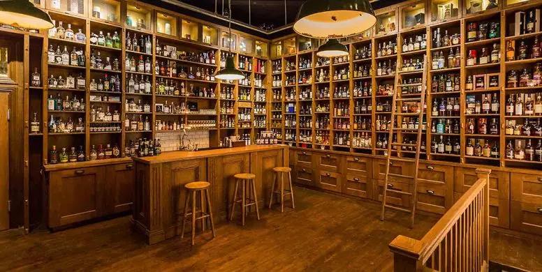 藏在地窖里的一個speakeasy風(fēng)格的酒吧,它的磚墻上籠罩著酒瓶和舊學(xué)校燈泡。這是由警察局改造的雞尾酒吧,看上去像是一個更高檔品種的藏酒閣。