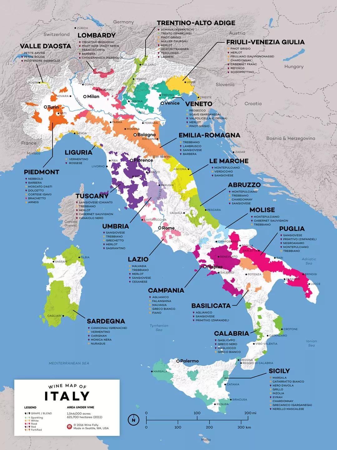 現(xiàn)時(2019年2月),意大利全國一共有118個IGT產(chǎn)區(qū)。