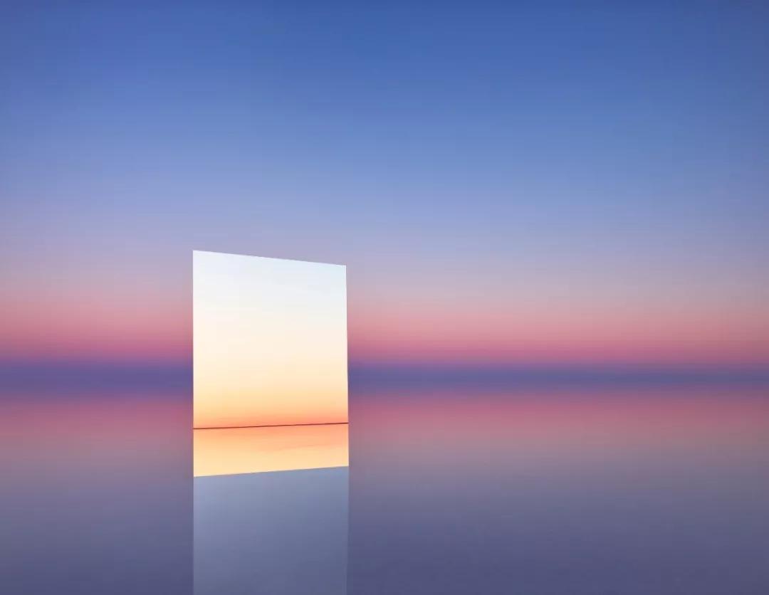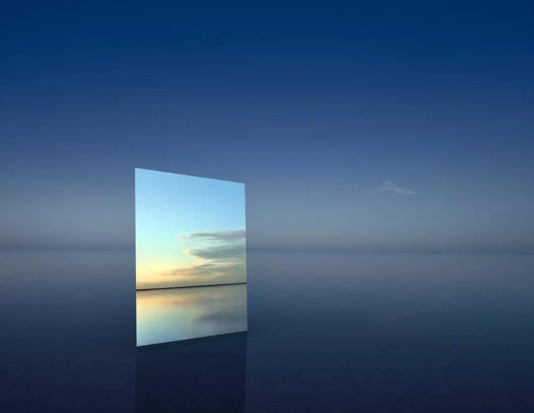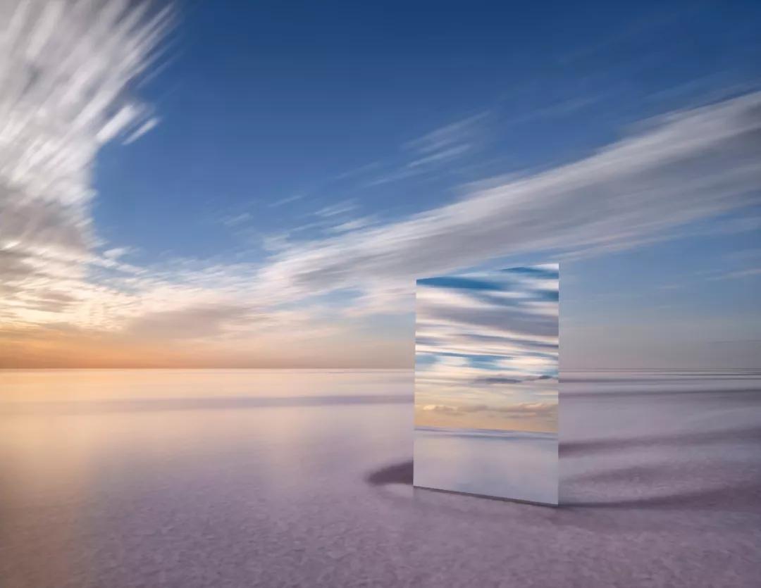 鏡子斜斜地立在湖面,因此能同時(shí)捕捉到湖面和天空的景色,周圍環(huán)境頗為荒涼,好像是自然環(huán)境正在虛榮的“顧鏡自憐”。湖水中的鏡子也將空間割裂的同時(shí)統(tǒng)一到了一個(gè)畫面里,在這極簡(jiǎn)的畫面中,鏡子仿佛通往另一個(gè)世界的任意門,也為人們提供了無限的想象空間。