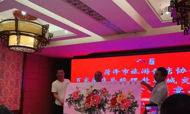(菏澤旅游飯店協(xié)會(huì)張榮琪會(huì)長代表考察團(tuán)一行向伊尹酒店贈(zèng)送牡丹圖)