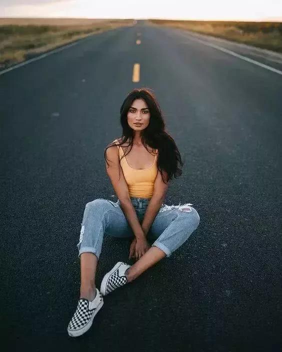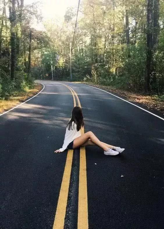 馬路上通常都會(huì)有標(biāo)記的線條,而這就是一個(gè)很好的利用道具。比較簡(jiǎn)單的拍照姿勢(shì)就是人坐在線上、斜坐在線上,或者是邁開腿站在線上。