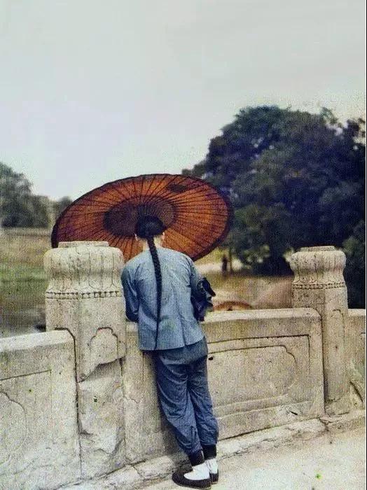 1912年,大同橋,一個男子打著傘靠在石橋上。