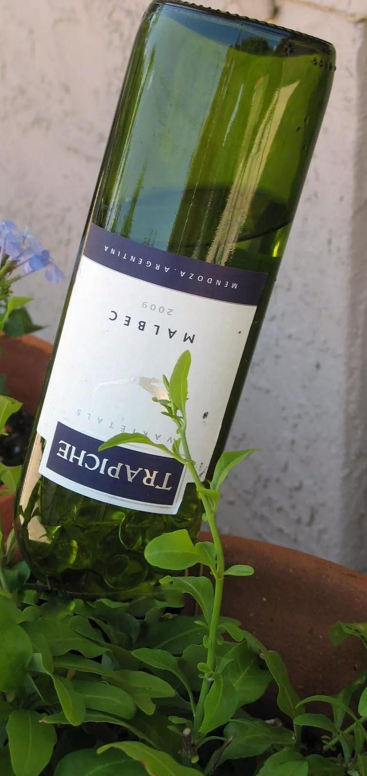 把酒瓶斜插入花盆中就可以形成一個灌溉裝置。
