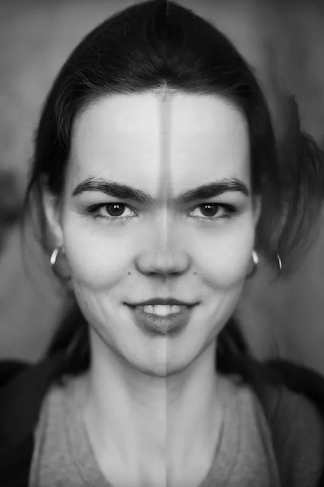 你也可以另辟蹊徑,不追求完美對(duì)稱——讓鏡面和臉部對(duì)稱軸重合,轉(zhuǎn)而在特殊的地方創(chuàng)造對(duì)稱面,同樣能收獲很有趣的照片: