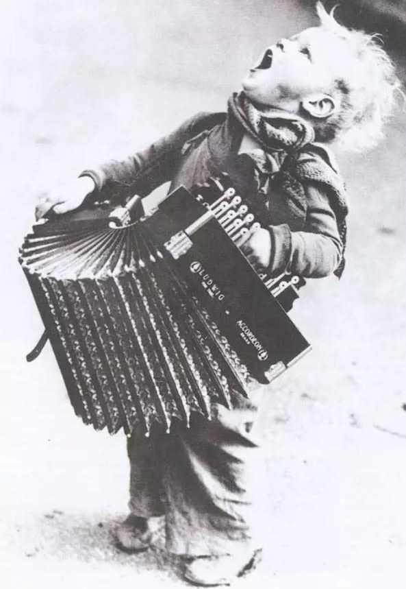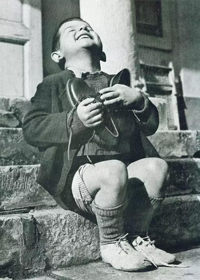 二戰(zhàn)中,第一次收到新鞋的小男孩,抱著鞋子開(kāi)心極了。他腳上的那雙真的不能再穿了。