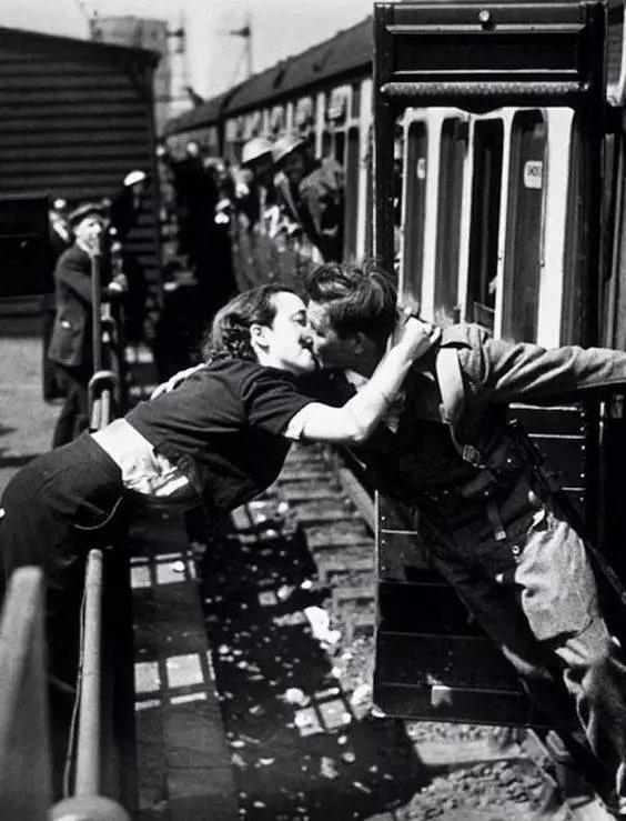 站臺(tái)前,隔著很遠(yuǎn)的距離,姑娘奮力起身,吻到了久別的愛(ài)人。