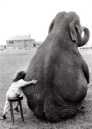 小女孩坐在凳子上,親昵地抱著身邊的大象,一大一小兩個(gè)背影,看起來(lái)如此和諧美好。
