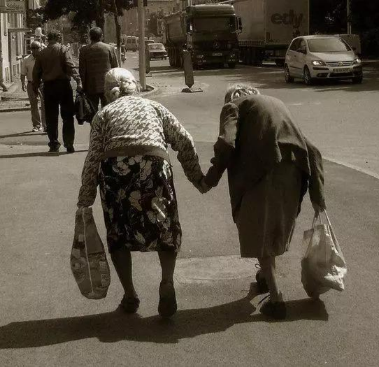 兩個(gè)年歲已經(jīng)很大的老奶奶,正牽著手慢慢地一步一步地往前走著。